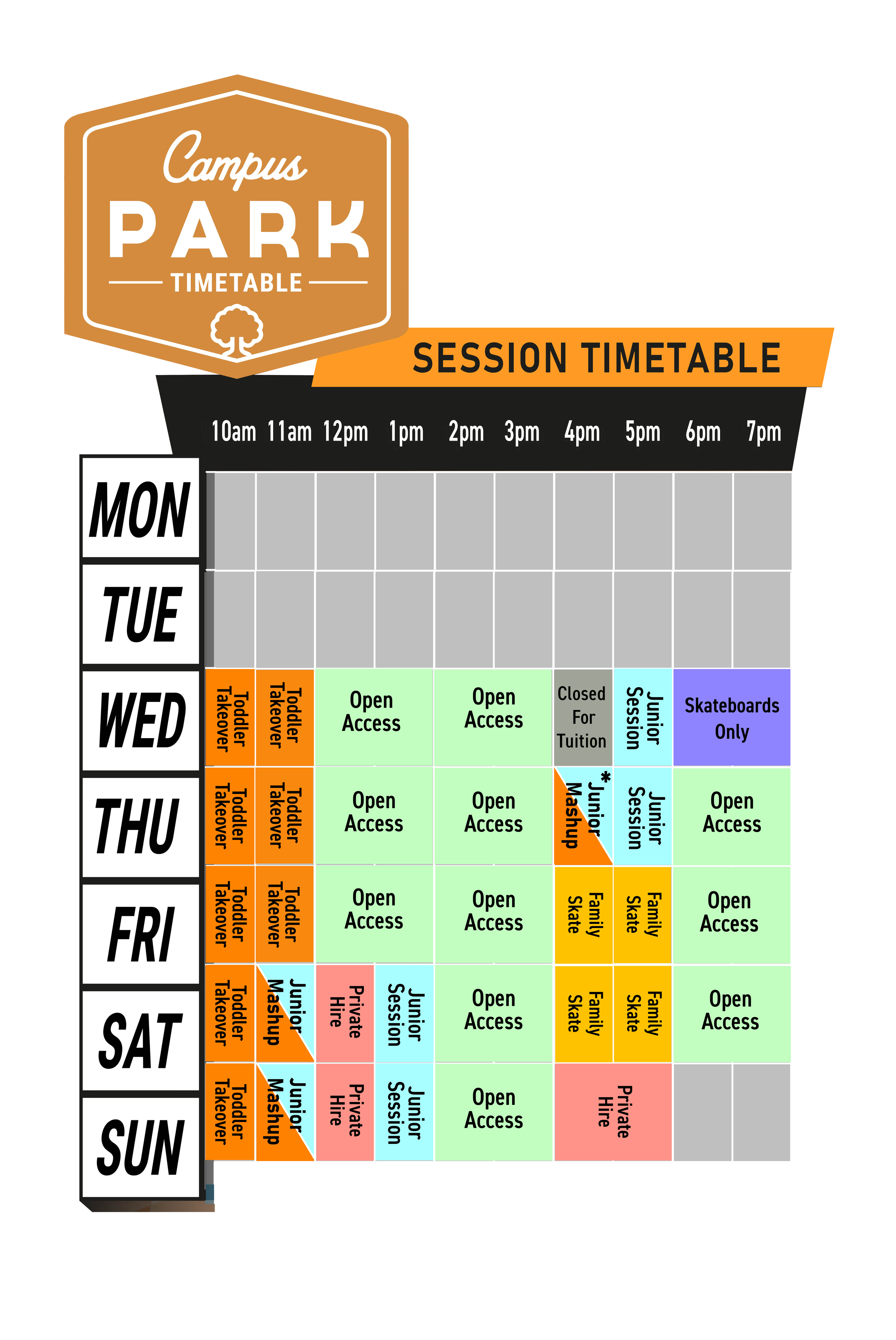 Please note: Our staff reserve the right to refuse entry to the skatepark to any person regardless of age should they think it inappropriate or dangerous. Do not book into sessions that are not for your age group as you may be refused entry and you will NOT be refunded.